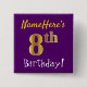 This simple square button design features a message like "NameHere’s 8th Birthday!", with the "8th" having a faux/imitation gold-like colouring look, on a purple coloured background. The name can be customized. Buttons like these could perhaps be worn by guests at a birthday party for somebody who is celebrating their eighth birthday, where the party is being held in a large area with lots of other people present (such as a city park or a theme park). [~Z0000166]