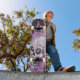 Funny skull surrounded by purple flames is a colourful skull that looks great on skateboards.