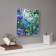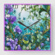 A vibrant design featuring purple flowers intertwined with lush greenery against a blended blue background, showcasing vivid floral patterns and natural elements.