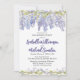 Romantic floral design features purple and blue wisteria gracefully draping across its vine. The vine and just a few flowers frames the bottom of the invitation. The same two borders are on the back of the engagement party invitation. A wisteria wreath is in the centre with the wedding couple's names. There is a soft purple/blue background on the back and white on the front. You can also change these colours to coordinate with your wedding scheme.