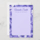 Blank stationery note cards featuring your name in an elegant script font with custom text below. Around the edge and on the back is a purple flower pattern.