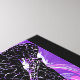 A colourful purple flowered design featuring the black silhouette of a giraffes head and neck.