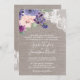 This purple flowers and lace formal wedding invitation card is perfect for a country wedding. The rustic chic design features a beautiful arrangement of plum purple, lilac and blush pink flowers with white floral lace on an elegant linen background.