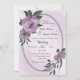 Unique wedding invitation featuring romantic dusty purple flowers and green leaves on a beautiful oval geometric frame.