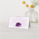 Beautiful romantic wedding place card featuring purple flowers and some green leaves .