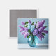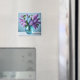 This magnet is shown with a photo print of beautiful purple flowers in vase.