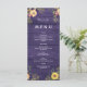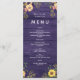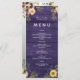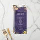 Elegant, modern, boho, rustic, rustic wood purple wedding menu with watercolor flowers.