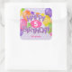 These fun and colourful birthday stickers feature the message, "Happy Birthday" spelled out in whimsically arranged realistic purple frosted cutout cookies surrounded by multicolor balloons and bunting flags - child's age and name can be personalized - background is a pattern of small white polka dots on a light purple background - by katz_d_zynes