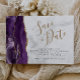 This elegant modern save the date card features a purple watercolor agate border trimmed with faux gold glitter. The customizable text combines gold-coloured handwriting script with black sans serif font on a white and silver grey marble background. The reverse side features a matching purple and gold agate design.