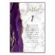 The left-hand edge of this elegant modern wedding table number card features a purple watercolor agate border trimmed with faux gold glitter. The word "table" appears in gold-coloured handwriting script on a grey and white marble background. Add the table number and the names of your guests who are assigned to each table.