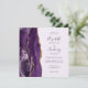 The left-hand side of this elegant modern square wedding invitation features a purple watercolor agate border trimmed with faux gold glitter. The customizable text combines charcoal grey handwriting, copperplate and italic fonts on a pale lavender background. The reverse side features a matching purple and gold agate design.