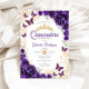 Purple, gold and white Quinceanera celebration invitation. Features, script font, gold butterflies, watercolor roses and tiara. Perfect for an elegant princess style glam celebration. Personalize with your own details. Printed Zazzle invitations or instant download digital printable template.