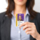 Colleges, universities, high schools, and institutes of higher learning can add sophistication to student photo identification badges with this modern, contemporary design, which features elegant lettering set on purple, gold, and white backgrounds. Customize with given and family names, student ID #, faculty name, name of college/university, years of study, and academic logo or slogan. Colours and font types can be modified as desired.