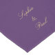 Purple Golden Beige Wedding Table Runner, please personalize the names of the couple, using the online personalization template before ordering. The names of the couple automatically appear on both ends of the runner, with the lettering the correct way up when the printed drop hangs down over the edge of the table at each end. A stylish table runner featuring elegant text in a golden shade of beige (faux gold / gold look) on dark purple.
