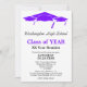 This vertical format minimalist class reunion invitation design features black and purple text on an all white background with three purple graduation caps as the top border. Personalize your information, remove information or edit using the design tool to select a font colour, size, and style your prefer.