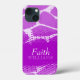 Bright animal patterned iphone case in bold purple hues. Personalise this item with your full name. This example currently reads: Faith Williams. This original pattern by Sarah Trett, is based on the patterning found on a giraffe with a halftone moiré dot gain pattern overlay.