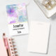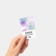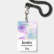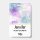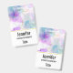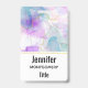 A name tag with a beautiful artistic painting. Created with flowing alcohol inks. Purple, green and blue colours flowing together. Thin wavy ribbons of gold intermingle with these soft gentle colours.
