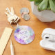Birthday (or other event) thank you favour key chain with a beautiful artistic painting. Created with flowing alcohol inks. Purple, green and blue colours flowing together. Thin wavy ribbons of gold intermingle with these soft gentle colours. A semi transparent circle with a faux gold foil border layered on top with your personalized text inside.