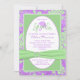 This bright and cheerful lavender purple, green, and white floral sip and see baby shower invitation for a girl has large peony or rose type flowers on it with a PRINTED mint green ribbon and PRINTED crystal jewels brooch on it. There is a small purple umbrella image below the arched Sip and See text. The text and paper is all customizable. It is shown here on basic paper. I would NOT use metallic gold, or silver paper as they will both severely darken/alter the colour of the card. ***PLEASE NOTE that if you change the font or size of the font, it may alter how your invitation prints. It will print the way you see it on your monitor, so if you have alignment issues, or sizing problems, please contact me for help before you order. I will not see your invitation once you order it, and Zazzle will NOT edit anything (typos, alignment, etc.). If you require assistance or would like any other matching items, please email your request to niteowlstudio@gmail.com.