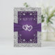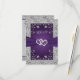 This romantic purple and grey floral wedding RSVP card is the smaller of two sizes available and it has an image of a pair of joined hearts overtop a purple ribbon image running across the centre of the response card. The backside has a grey background with your RSVP details and meal selections printed in purple with a purple floral arch surrounding the wording at the top. There is a simulated silver border around the entire card on the front and at the top and bottom of the back. If you need any additional matching items, please email your request to niteowlstudio@gmail.com or use the Zazzle chat feature to get in touch.