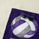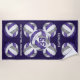This fun volleyball themed beach towel features a pattern of purple, grey and white stylized volleyballs arranged in a mirrored pattern with customizable text between the volleyballs, currently team name & mascot name - the athlete's name and jersey number can be personalized, as well as the darker purple background - by katz_d_zynes