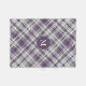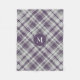 Purple and grey fleece blanket with diagonally oriented plaid pattern in shades of purple with white accents on a medium grey background and customizable monogram on a purple circle pendant - by katzdzynes