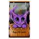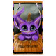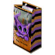 Detail of my "Is I Scary?" painting - a little purple kitty in a carved pumpkin with the top on his head. The night sky, moon, and mist are in the background. The image all over the bag is striped orange, purple, and black stripes. There is a text field on the front and another on the back that you can edit. You can also click on the "Customize it!" button to add more text, images, etc. to create your own design