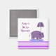A cute design featuring a purple hippo with a shaded purple umbrella, a few rain drops falling down. A striped purple border along the bottom. Customize as desired.