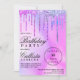 This girly and glamourous birthday party invitation is perfect for a stylish and trendy girly girl. It features faux printed sparkly magenta, lilace purple, and pastel blue glitter drips on top of a purple holographic iridescent foil background. The typography is an elegant cursive script with a modern serif font to match. It's chic, pretty, unique, and luxurious.