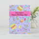 This invitation is great for a tween's birthday party celebration, ages 7 through 14. All words are easy to customize. One side a the invitation has a design of colourful original art of random birthday cakes and cupcakes, the word art "happy birthday", balloons, candles, streamers and dots on a lavender periwinkle purple background. A fuchsia hot pink strip has the customizable words "You're invited to", a personalized name and "12th birthday party" that are easy to change for another year. The other side has all the fields for your party. The border is the same art with a hot pink outlined light lavender area for all the information. Easy to customize to create your own invitation for other events.
