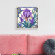 A purple iris flower with yellow accents, surrounded by green leaves and a blue floral border, art nouveau style, intricate details, vibrant colors, elegant design.