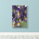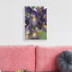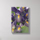 Colourful floral photograph of purple iris flowers in a clear vase with a blue background. The irises flower photo makes great for purple iris flower art gifts! Make a custom iris floral wrapped canvas art print with your personalized art design.