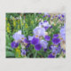 A lovely garden of tall purple irises, yellow flowers in the background.