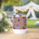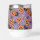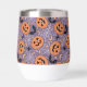 This design features a vibrant Halloween pattern with a playful and cute design. The pattern showcases bright orange jack-o'-lanterns with various cheerful and friendly expressions. These pumpkins are surrounded by a purple background filled with white spiderwebs, black bats, crescent moons, stars, candy corn, and small spiders. The overall theme is fun and festive, making it perfect for a lighthearted Halloween decoration or themed design. The colour palette is a mix of traditional Halloween colours—orange, black, and purple—with added touches of white and yellow for contrast.