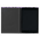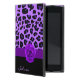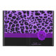 Stylish iPad mini case, with built in stand and graphics of a wild purple and black jaguar fur print. A solid black bottom of the case and graphics of a purple ribbon between the two backgrounds, is decorated with graphics of a rich purple rose. Text in lavender, at the bottom, is ready to personalize. Makes an excellent gift idea.