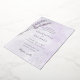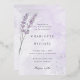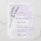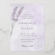 Elegant wedding invitation, featuring watercolor Lavender flowers and silver foil spatter. Presented on a sheer purple watercolor wash background.