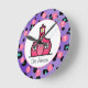 A clock featuring a purple leopard print design and the logo of The Pink Schoolhouse. Personalize with your name under schoolhouse. Clock features white numbers on pink dots.