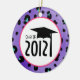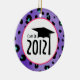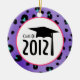 An ornament featuring a purple leopard print background. "Class of 2012" text inside pink circle with graduation cap illustration.