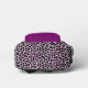 This personalized backpack features a pattern of purple and black leopard spots on a white background. Add a monogram and first name in modern black and white script to the purple pocket, with the full name below in white sans serif font. Ideal for back to school!
