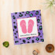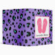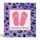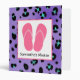 A binder with a purple leopard print design covering outside surface. Front features an illustration of a pair of pink flip flops inside a white square with pink trim. Personalize the text.