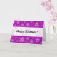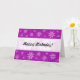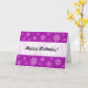 A card with an abstract purple marble like texture with flower motifs. Happy Birthday on the front on a white overlaid effect band and on the inside.
