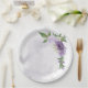 Beautiful purple mauve and white flowers & green leaves against watercolor background botanical wedding paper plate