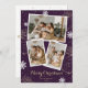 Purple photo Merry Christmas card featuring snowflakes and Christmas gifts. Easily personalize this photo collage holiday card with your photos and text.