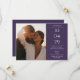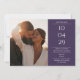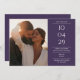 A modern minimalist save-the-date card featuring your special date, photo and wedding details set in classic, chic typography on a purple background. Designed by Thisisnotme©