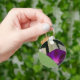 The image on the key chain is a pink-purple Morning Glory wildflower under a leaf, while other leaves cast shadows on a wooden fence.