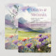 Purple Mountains & Poppies Wedding Invitation features a beautiful mountain scene with spring and summer colors of green meadows, purple mountains and colorful mountain wildflowers. Front of card has a customizable invitation ready for your own wedding information. Back of card showcases a beautiful ring of lavender mountain wild flowers with customizable initials for the happy couple. The Purple Mountains & Poppies Wedding Invitation coordinates perfectly with the Purple Mountains & Poppies Wedding RSVP Reply Card with beautiful majestic mountain watercolor scenes. Visit our Mountain Thyme Wildflower Wedding Suite to see all of our coordinated stationery and wedding supplies.