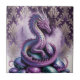 A fantasy digital art piece of a majestic purple and blue dragon curled around a stack of glowing purple and turquoise stones. The dragon has iridescent scales with a gradient from deep purple to bright blue, detailed with intricate patterns and spikes along its back. Its body is coiled in a graceful S-shape, resting on and wrapping around several large, smooth stones of varying sizes. The stones emit a soft purple glow and are partially submerged in a reflective purple-tinted water at the bottom of the image. The background features an ornate damask pattern in light beige against a deep purple backdrop, creating an elegant Victorian atmosphere. The dragon's head is raised in a regal pose, with pointed ears, a long snout, and glowing yellow eyes. Its tail curls around the stones in a decorative manner. The overall composition has a mystical, ethereal quality with a purple and blue color scheme that creates a cohesive, fantasy-like atmosphere.