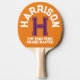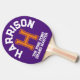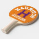 Personalized ping pong paddle with your name and family name initial and team or slogan in white, purple and orange, one side has background in dark purple the other in bright orange. Reads Harrison H The ping pong grand master. Personalize this bold sports style paddle with your own name and initial and team name or add a slogan. Designed by www.mylittleeden.com on zazzle.