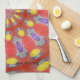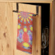 vibrant colours in purple orange and yellow make a unique kitchen towel to brighten your kitchen