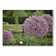Purple globe shaped flowers stand tall against a green garden backdrop.